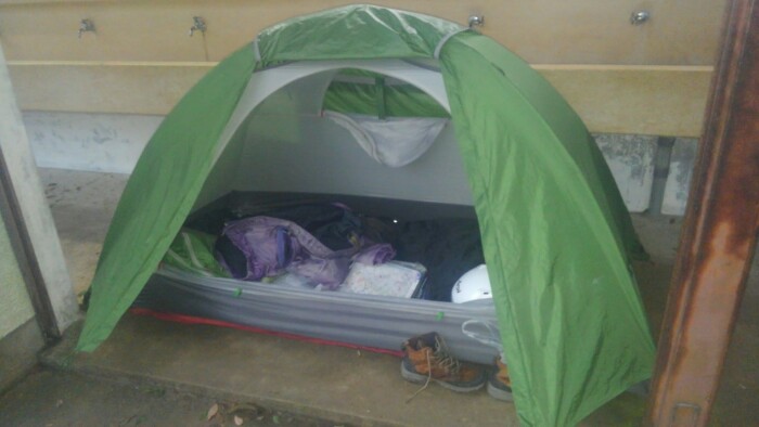 エアマットでコンクリも大丈夫、アルミ蒸着クッション入らなかったので置いてきたらエアマット保温性はいまいちみたいなので、伝家の宝刀アルミ蒸着シートをエアマットの上に敷いてみた、どうなるか、シートは寝袋ごとくるまって寝たら、とても暖かかったけど密閉良すぎて寝袋がびちょびちょになった代物なので寝袋の下にひくだけ。