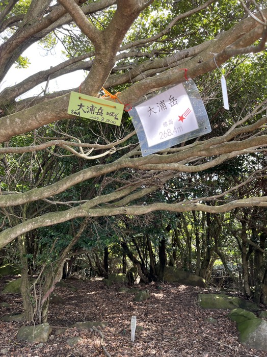 2022/03/22 14:28阿川の大浦岳へ山頂アンテナ群の間にひっそりと三角点が。四等三角点、やっぱ標石がショボい。ここも「石」忘れて来た。