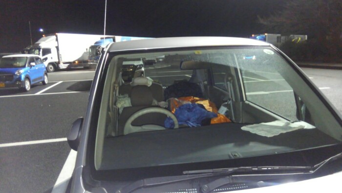 あと二時間ほどで着くけど、眠いのと腹へったのと夜中に着いてがさがさすんのもやなので、ここをキャンプ地とする。