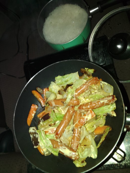 レトルトカレー買ってあったんやが口がカレーや無いのと、明日もしかしたら食材無いとこ行くかもしれんので、コンビニにウインナー有ったんで焼き飯しょ思たけど、めんどくさいんで野菜マヨネーズ炒め。