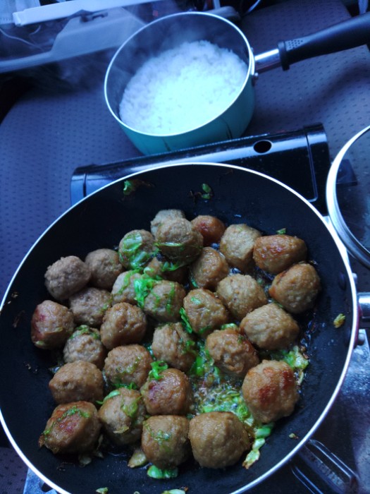 業スーの鳥肉団子180やすー、めんつゆ炒めー。