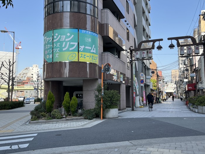 2023/03/07 10:22天神橋1丁目の山道の銀杏歴史ですね。福岡長い長い日本一長い店が商店街の入り口となります。そして天神橋1丁目の交差点です。