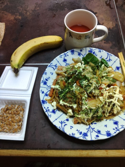 2023/08/05 12:32からし焼きそば。あ、塩分減らすのに納豆たれからし抜きで食っててるけど、余ったからしまとめて焼きそばに入れてたら一緒か。その分味つけのめんつゆ減らしてるからまあええか。
