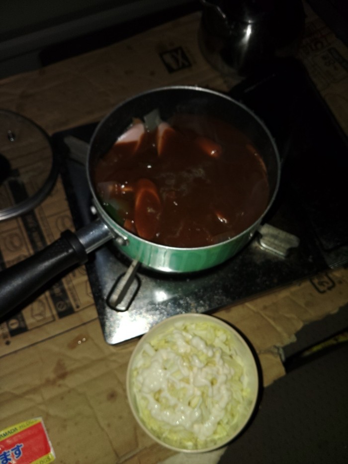ニンジンと玉葱とピーマンと魚肉ソーセージ(常温保存品ゲットだじぇー)と業スーレトルトカレーとキャベツゥ~