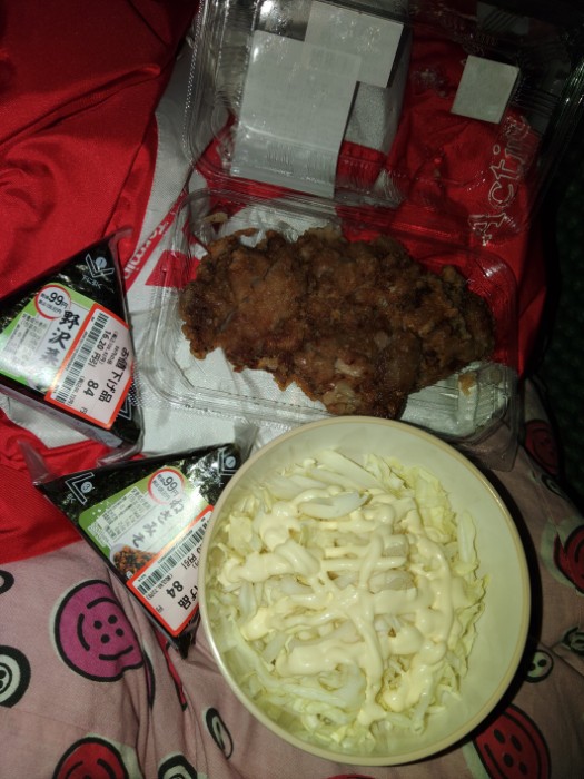 2024/01/18 17:16山賊焼とおにぎり2つ、共に二割弱引きで併せてワンコイン。買い食いや外食増えたのはタイヤ積んで煮炊きが大変やから。