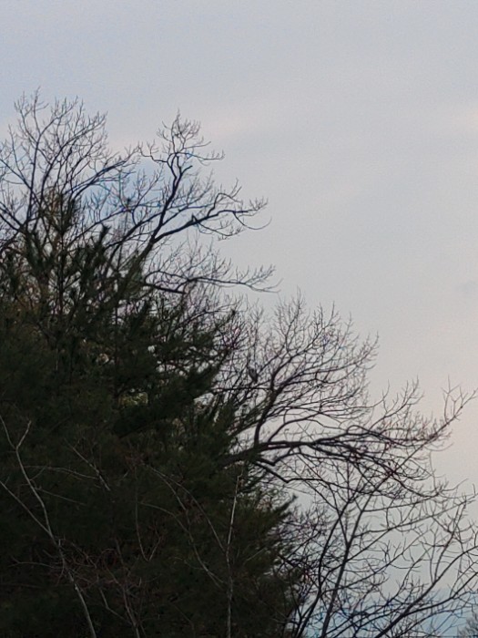 その後、隣の南の池から一羽来て、元の一羽も舞い上がって、しばし二羽で舞った後、二羽とも浮き島の上の木に。上の方真ん中ちょい左に一羽、ど真ん中ちょい左にもう一羽。