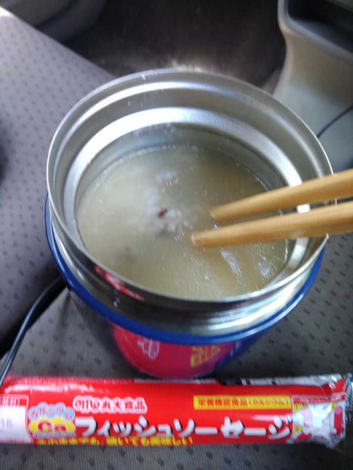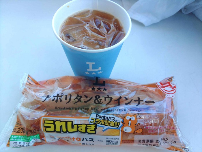 今日はこれ~PontaパスのLAWSONクーポンでコーシー無料パン半額~途中にイトインのLAWSON有ったんで~家からの魚ソーは後で~