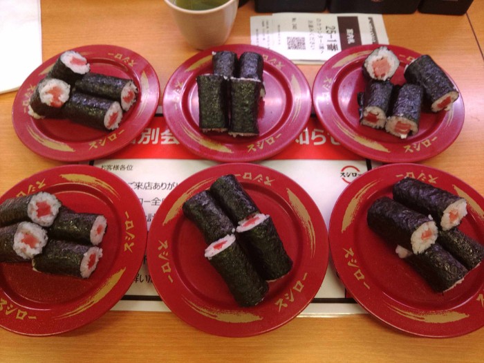 高田から帰りのファミレス街道も今晩までなのでストレス解消に本命の鉄火巻き~(笑)~1皿110円の頃が懐かしい~涙~でも、じじい割で平日5%引き~