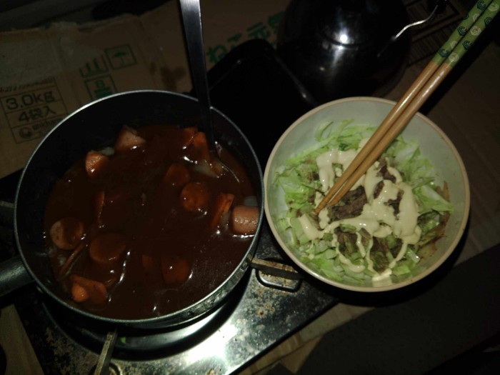 2025/11/02 18:02業スーのレトルトカレーにプラス~無洗米30分うるかしてる間に野菜切ったり炒めたりしてても~なんやかんやで片付け終わるまでに1.5h~うーん~(笑) さあ助手席を台所からベットに戻そ~(笑)