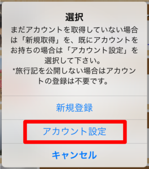 旅行記を公開する場合は、このボタンを押してアカウントの取得を行って下さい。旅行記を公開しない場合はアカウントの取得は不要です。詳細については「4.自分の旅行記を公開する」を参照して下さい。