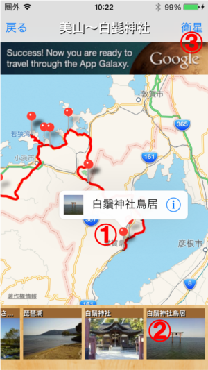 地図上のアイコンにタッチすることで、写真のサムネイルとタイトルが吹き出しとしてアイコン上に表示されます。